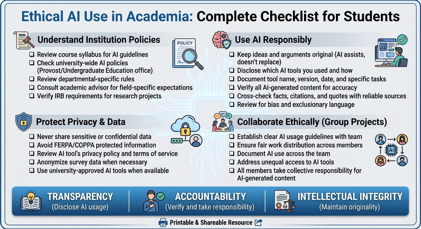 A comprehensive checklist for students and academics to use AI tools responsibly while maintaining transparency, accountability, and academic integrity.